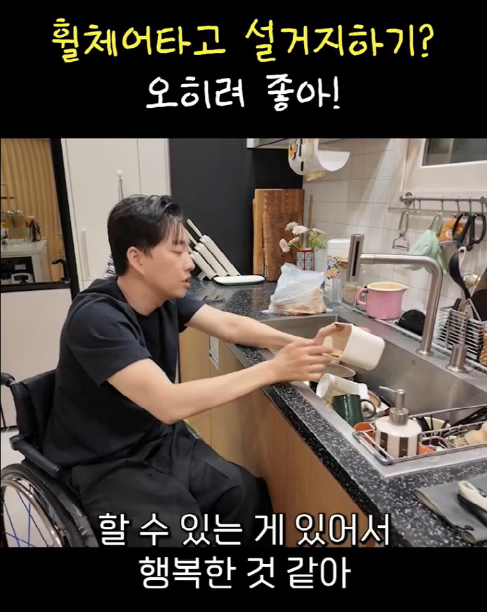 영상 속 휠체어에 앉은 채 싱크대 앞에서 설거지 중인 박위의 모습이 담겼다.