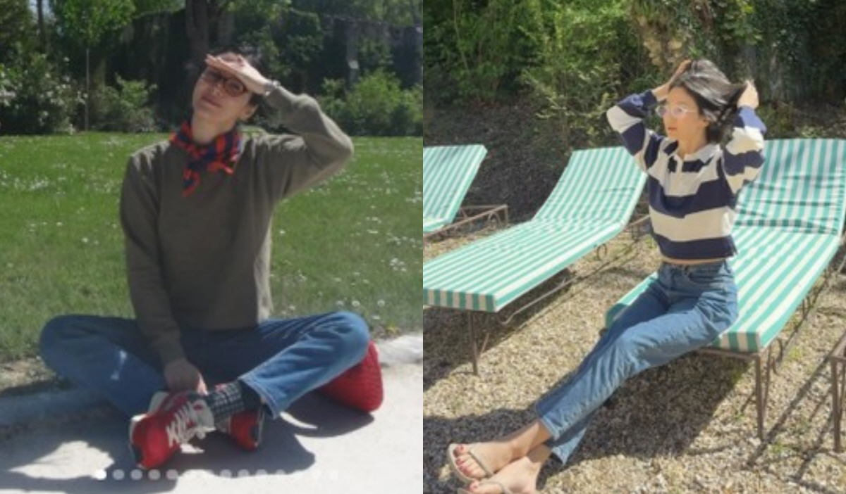 이어진 사진에서는 넓게 펼쳐진 잔디밭 한가운데 앉아 햇빛을 가리는 듯 손을 이마 위에 얹고 있는 모습이 포착됐다. 카키톤 맨투맨에 데님 팬츠, 레드 스니커즈를 매치한 캐주얼한 차림이다. 다리를 교차해 앉은 채 고개를 살짝 기울인 포즈가 한층 여유로운 무드를 더한다.