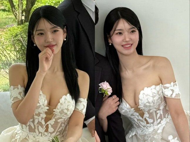 공개된 사진 속 순자는 플라워 장식이 더해진 화이트 웨딩드레스를 입은 채 꽃을 들고 서 있다. 남편과 나란히 선 모습에서 사랑스러움과 예비 신부의 단아한 분위기가 강조된다.