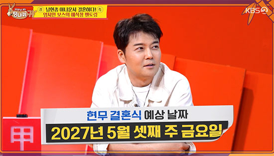 이날 전현무는 요즘 예식장 잡기가 쉽지 않다는 말에 "내년 (2027년) 5월 셋째 주 금요일에 결혼식을 하겠다"고 너스레를 떨었다.