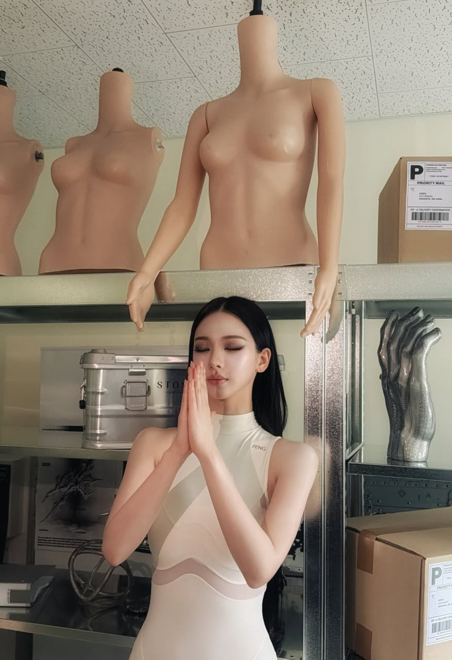현실과 조형물의 경계를 흐리듯 완벽한 비율과 매끈한 몸매 라인은 실제 마네킹보다도 더 비현실적으로 느껴질 정도로 강렬한 존재감을 발산하며 보는 이들의 시선을 압도했다.
