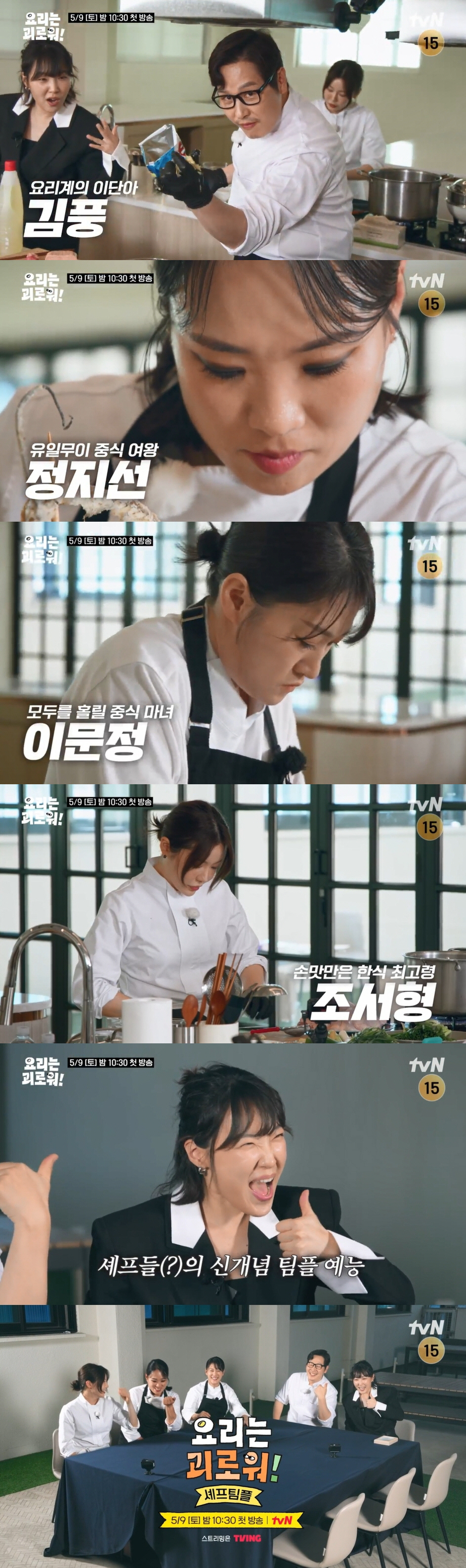 특히 카리스마 가득한 정지선, 이문정, 조서형 셰프와 달리, 김풍이 생 양파를 씹어먹고 과자를 주먹으로 으깨는 장면, "요리는 괴롭지만 그래도 좋다"고 다 함께 외치는 장면은 이들이 선사할 차별화된 요리 여정을 기대케 한다. 뿐만 아니라 방송의 재미를 배가시킬 첫 회 게스트로 궤도, 조나단, 이사배가 출격을 알려, 4인의 셰프와 게스트들은 어떤 케미를 보여줄지 이목이 쏠린다.