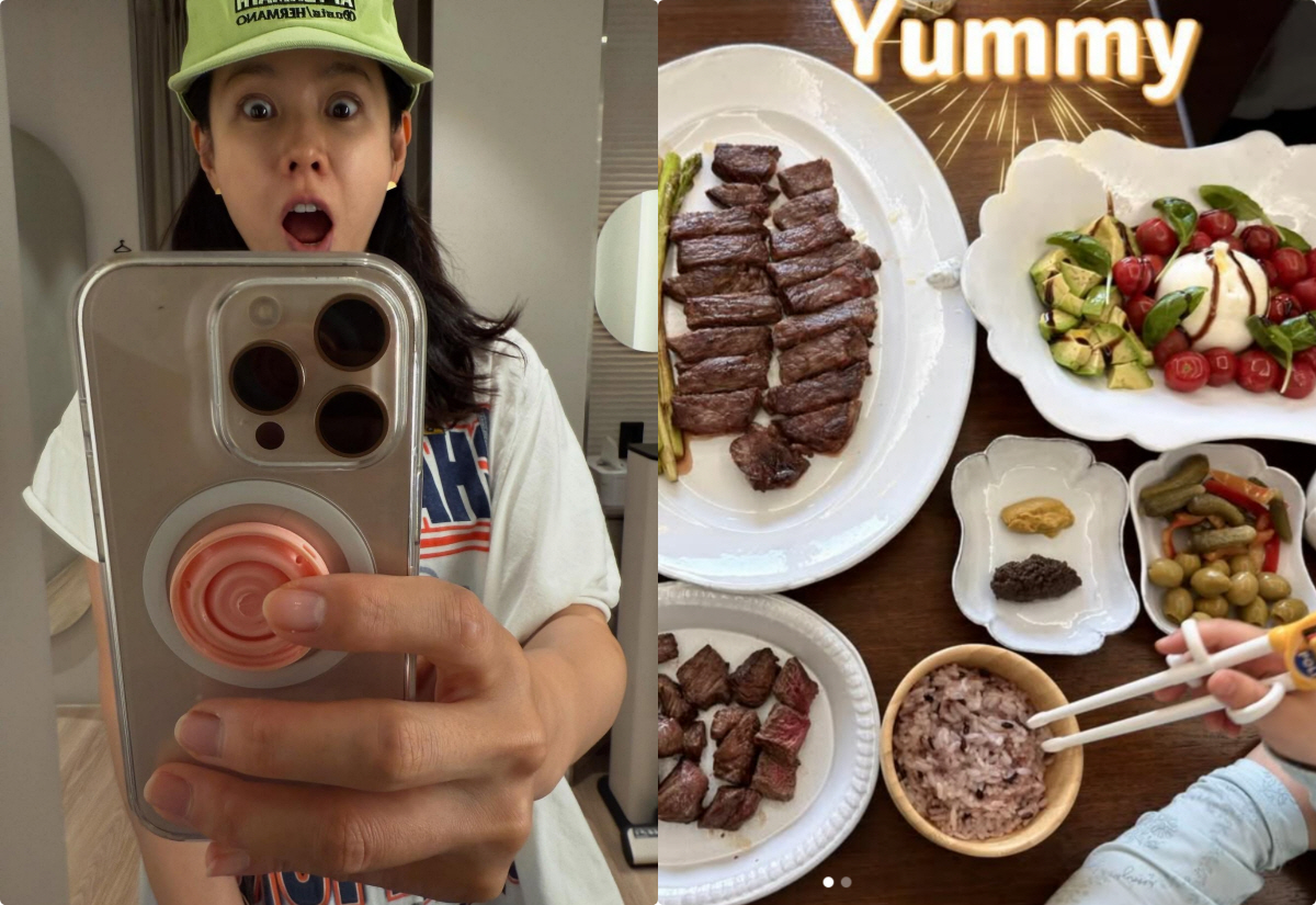 공개된 사진에는 손예진이 직접 차린 것으로 보이는 정갈한 한 상이 담겨 있다. 스테이크와 각종 야채 구이는 물론 수제 피자까지 더해져 한층 풍성한 식탁을 완성했다. 특히 고풍스러운 접시에 정성스럽게 담긴 플레이팅이 시선을 사로잡으며 '홈 파인 다이닝'을 연상케 했다.
