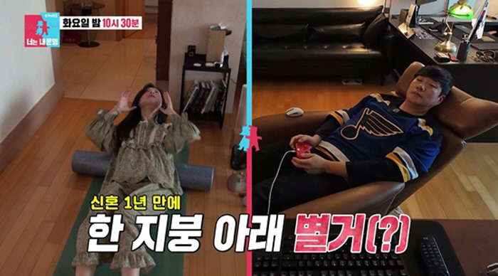 그러나 달달한 분위기도 잠시, '신혼 1년 만에 한 지붕 아래 별거(?)'라는 자막과 함께 각자 다른 방에서 시간을 보내는 부부의 모습이 그려졌다. 배성재는 방 안에서 홀로 게임에 열중했고, 김다영은 거실에서 차를 마시고 운동을 하며 혼자만의 시간을 보냈다.