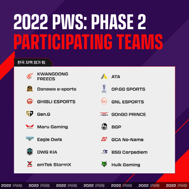 PWS: 페이즈2에는 한국, 일본, 대만/홍콩/마카오의 최정상 기량을 갖춘 48개 팀들이 출전한다. 한국에선 젠지, 광동 프릭스, 다나와 e스포츠, 담원 기아 등 총 16개 팀이 참가한다. 이들은 6주간 총상금 1억 9500만원과 권역별 대회인 '펍지 콘티넨탈 시리즈(PCS) 7' 티켓을 두고 치열한 승부를 펼친다.
