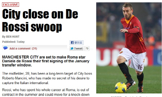이탈리아 AS 로마의 스타플레이어 다니엘 데 로시가 잉글랜드 신흥 부자구단 맨체스터 시티로 이적할 것으로 보인다.