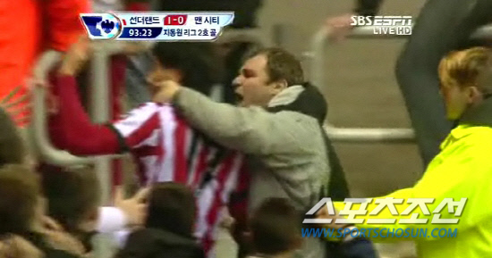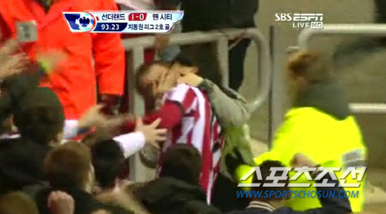 얼마나 좋았으면 그랬을까. '베이비지' 지동원(21·선덜랜드)이 홈에서 열혈 팬에게 입술을 뺏겼다. 지동원이 맨시티전 후반 48분 짜릿한 버저비터 결승골을 쏘아올리던 바로 그순간이었다. 흥분을 감추지 못하고 그라운드에 난입한 한 남성 관중이 지동원에게 뜨거운 키스를 날렸다. 예기치 못한 돌발상황이었지만 현장은 이미 흥분의 도가니였다. 모든 것이 용서될 만큼 그렇게 좋았다.