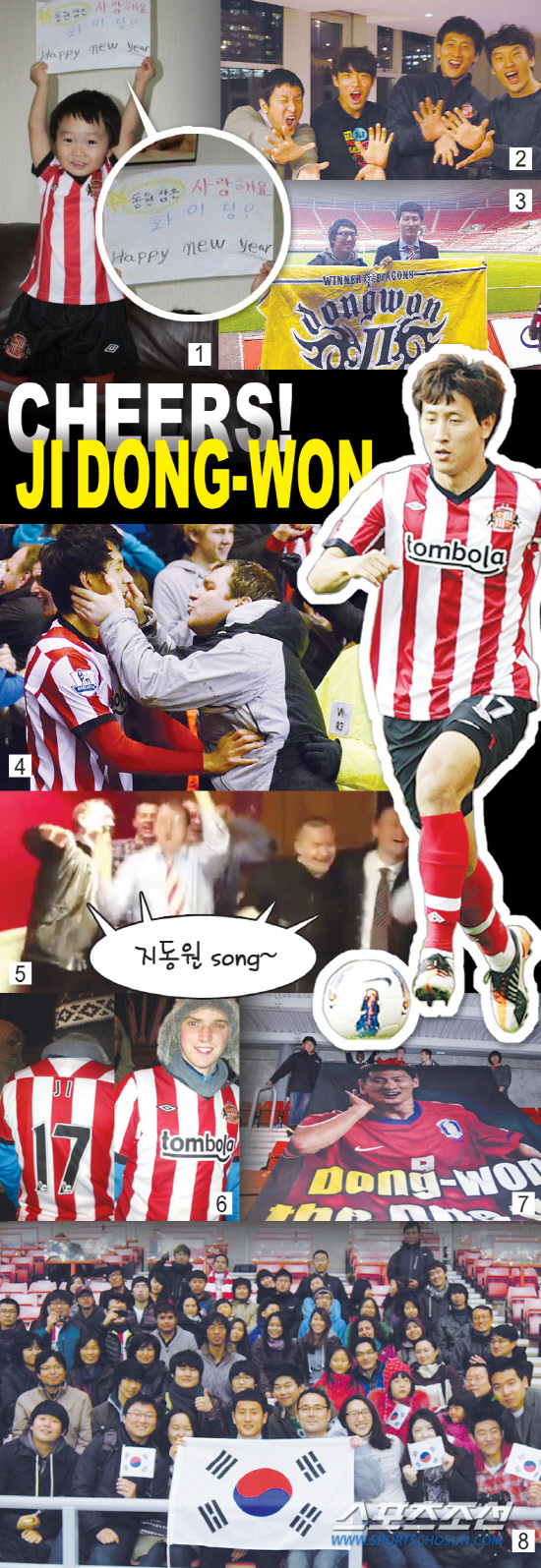 4일 새벽 위건전, 선덜랜드가 4대1로 앞서가던 후반 44분 지동원이 투입되자 신바람이 날대로 난 선덜랜드 원정 서포터스들은 목이 터져라 '지동원 송'을 불러대기 시작했다. 선두 맨시티를 울린 치명적인 한방, 맨시티전 결승골은 '베이비 지' 지동원을 '슈퍼 히어로'로 만들었다. 4세 꼬마 팬부터 그라운드 돌발 키스남까지 '베이비 지' 지동원의 미래를 응원하는 사람들의 풍경들을 모았다.