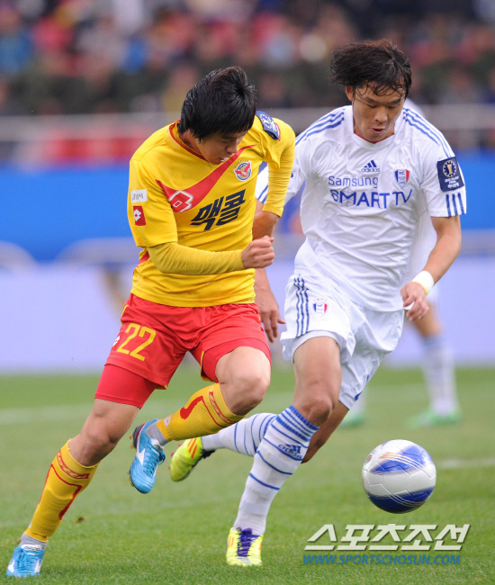 | 지난해 FA컵 결승전에서 성남 전성찬(왼쪽)과 볼을 다투고 있는 수원 수비수 곽희주. 송정헌 기자 songs@sportschosun.com |