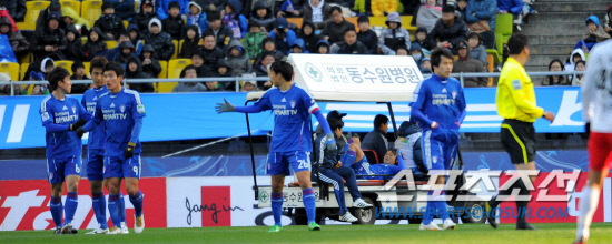 | 지난 해 11월 벌어진 수원과 부산의 6강 플레이오프. 경기중 부상한 곽희주가 카트에 실려 그라운드를 빠져나가고 있다. 허상욱 기자 wook@sportschosun.com |