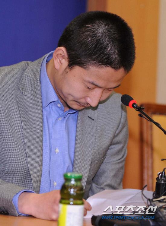 | ◇이천수가 6일 전남 구단 게시판을 통해 사죄와 K-리그 복귀의 뜻을 담은 장문을 남겼다. 그러나 전남은 복귀가 시기상조라는 입장을 거듭 천명했다. 전남 시절이던 2009년 K-리그 개막전에서 주먹감자 세리머니로 징계를 받은 이천수가 사과 기자회견에 나서 고개를 숙이고 있다. 스포츠조선DB |