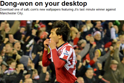◇선덜랜드 구단 공식 홈페이지 는'7일 지동원을 당신의 컴퓨터에 '라는 제하에 2종의 월페이퍼를 제작, 다운받을 수 있도록 했다. 맨시티전 결승골의 짜릿함을 영원히 간직할 수 있게 됐다. 사진 캡처=선덜랜드 구단 홈페이지
