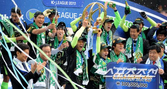 4일 전주월드컵경기장에서 K리그 2011 챔피언십 챔피언결정전 2차전 전북현대와 울산현대의 경기가 열렸다. 전북이 울산에 2대1 승리를 거두며 최종우승을 확정했다. 우승을 차지한 전북현대 선수들이 우승트로피를 들어보이고 있다. 전주=송정헌 기자 songs@sportschosun.com