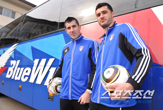 | 라돈치치와 함께 수원 삼성 구단 버스 앞에서 포즈를 취한 스테보(왼쪽). 화성=김경민 기자 kyungmin@sportschosun.com |