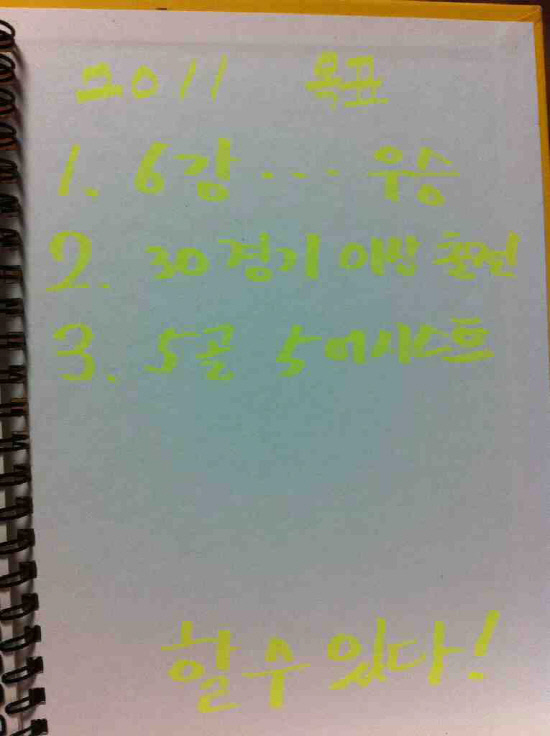 노란색 형광팬으로 '2011 목표'라고 쓴 뒤 세 가지를 써 내려갔다. '6강…우승' '30경기 이상 출전' '5골 5어시스트.' 맨 아래에 '할수있다!'라고 적으며 2011년의 꿈을 그렸다.