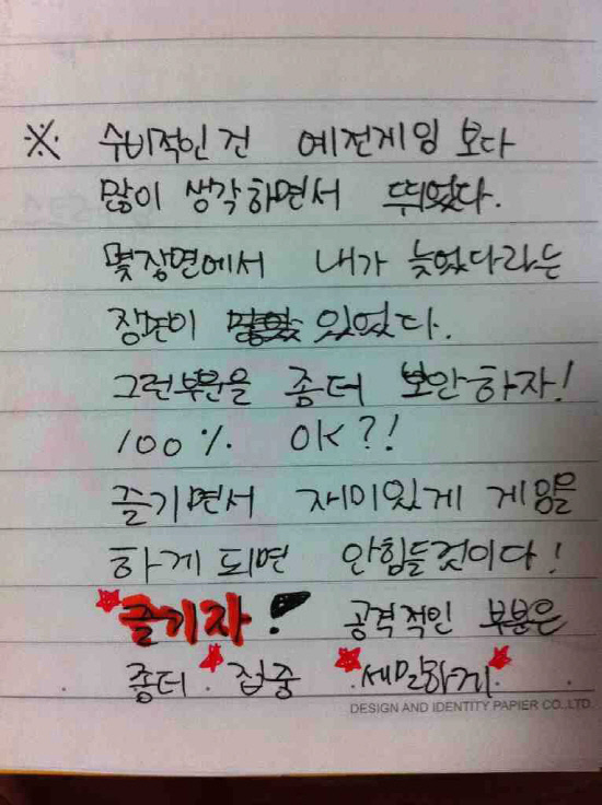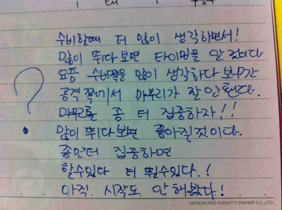 "매년마다 노트 첫 장에 목표를 적는데 2012년꺼는 아직 안 적었다. 보통 팀 성적, 개인 목표를 적는다. 그 뒤에는 매경기 마다 잘한 점, 못한 점을 적게 된다."