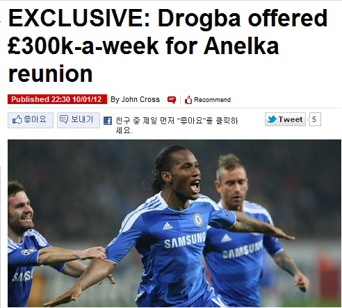 디디에 드로그바(첼시)가 상하이 선화로부터 주급 30만파운드(약 5억3600만원)에 영입제의를 받은 것으로 알려졌다.