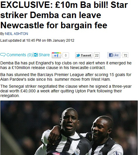 바는 현재 아프리칸네이션스컵에 출전 중이다. 뉴캐슬은 팀 공격의 핵심을 놓치지 않기 위해 재계약을 추진 중인 것으로 알려졌다.