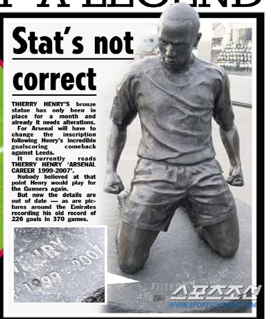 문제는 앙리 동상 아래에 있는 문구다. 동상 아래에는 'THIERRY HERNY(티에리 앙리)'와 함께 'ARSENAL CAREER(아스널 경력) 1999~2007'이 새겨져있다. 동상을 만들때까지만 해도 앙리가 아스널로 돌아올 지 아무도 예상하지 못했던 것이다. 더선은 '리즈와의 FA컵 64강전에서 앙리가 골을 넣음에 따라 동상에 새겨진 경력을 바꾸어야 한다'고 제언했다.