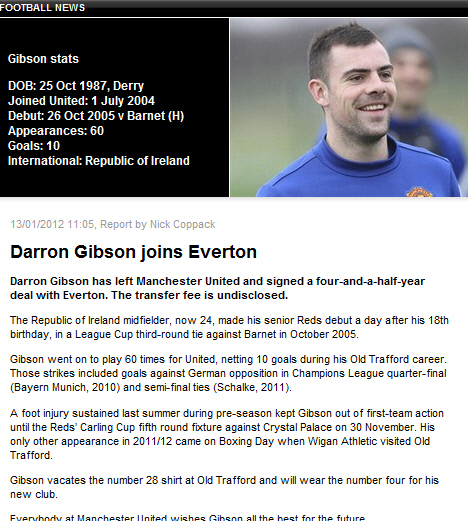 깁슨은 올시즌을 앞두고 부상을 해 12월이 돼서야 첫 경기를 치렀다. 올시즌 단 두 경기 출전에 그친데 이어 최근에는 루니와 함께 박싱데이 때 파티를 즐긴게 퍼거슨 감독에게 발각돼 징계르 받기도 했다. 이런 가운데 중앙 미드필더가 필요했던 에버턴이 깁슨에게 적극적인 러브콜을 보내면서 이적이 성사됐다.