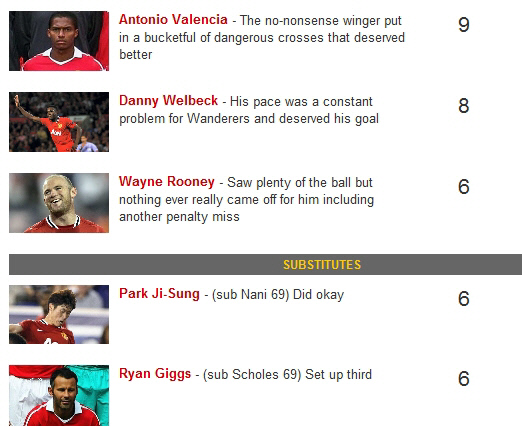 이 신문은 이날 오른쪽 측면 미드필더로 선발 풀타임 출전한 발렌시아에게 가장 높은 평점 9점을 주었다. 또 MVP에 해당하는 '스타맨'으로 선정했다. 선수 복귀 두 경기 만에 선제 결승골을 넣은 스콜스와 한 골씩을 보탠 웰벡, 캐릭 모두 평점 8점을 받았다. 몇 차례 골 기회를 놓친 루니는 평점 6점을 받았다.