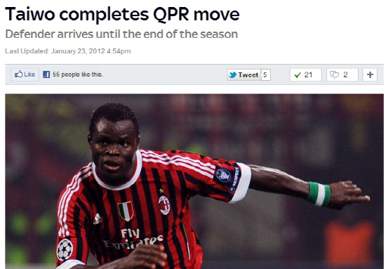 24일(한국시각) 영국 스포츠전문채널 스카이스포츠는 QPR이 이번시즌 끝까지 타이워를 임대하기로 했다고 보도했다. 2010년 남아공월드컵서 나이지리아 대표팀 선수로 국내팬들에게 잘 알려진 타이워는 수비보강을 원하는 첼시, 맨유, 리버풀 등의 러브콜을 받았다.