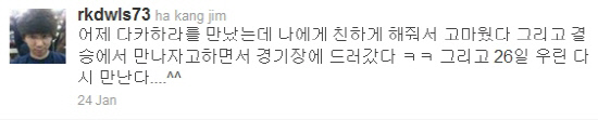 하강진은 트위터에 홍콩 그라운드에서 마주친 다카하라와 반갑게 인사를 나눴다고 소개했다. '어제 다카하라를 만났는데 친하게 해줘서 고마웠다. 그리고 결승에서 만나자고 하면서 경기장에 들어갔다. 그리고 26일 우린 다시 만난다'