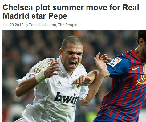 29일(한국시각) 영국 주간지 더피플은 첼시가 올여름 수비 강화를 위해 레알 마드리드에서 입지가 줄어가고 있는 페레의 영입을 시도할 것이라고 보도했다. 페페는 스페인 프리메라리가 최고의 수비수 중 하나로 꼽히지만 다혈질적인 성격때문에 많은 비판을 받아왔다. 최근에는 리오넬 메시의 손을 밟는 행위로 팬들의 지탄을 받았다. 조제 무리뉴 감독과 선수들은 페페의 행위에 고의성이 없다고 두둔하고 나섰지만, 귀족적 분위기의 레알 마드리드 운영진은 이같은 페페의 행위에 대해 불만을 갖고 있는 것으로 알려졌다.