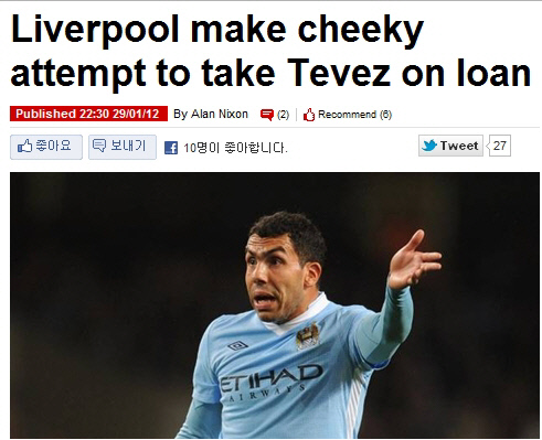 30일(한국시각) 영국 일간지 데일리미러는 리버풀이 맨시티에 테베스를 임대로 데려오고 싶다는 뜻을 전했다고 보도했다. 리버풀은 테베스의 주급 20만파운드를 포함, 임대료로 500만파운드까지 지불하겠다고 한 것으로 알려졌다.