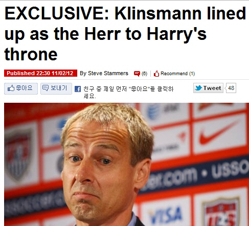 12일(한국시각) 영국 일간지 데일리미러는 토트넘이 해리 레드냅 감독의 후임을 물색 중이며, 그 중 클린스만 감독이 강력한 후보로 떠오르고 있다고 보도했다. 레드냅 감독은 아직 공식입장을 밝히고 있지는 않지만, 파비오 카펠로 감독의 깜짝 사임으로 공석이 된 잉글랜드 대표팀 감독직으로 자리를 옮길 것이 확실시 되고 있다.