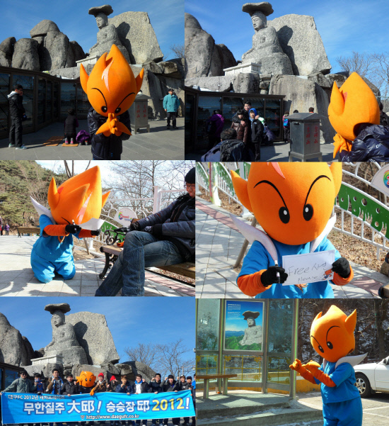 대구FC 마스코트 '빅토'가 팬들과 함께 8강 기원 갓바위 등산 이벤트를 펼쳤다. 사진제공=대구FC