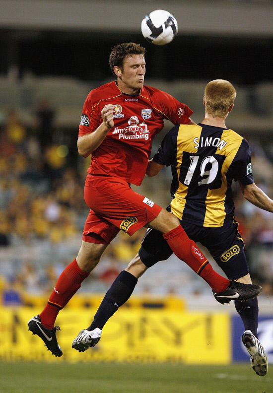 2009년 호주 A-리그 시절 센트럴 코스트 매리너스 소속 사이먼(오른쪽)과 애들레이드 유나이티드 소속 코니가 공중볼 경합을 벌이고 있다. 사이먼은 이 사진을 보며 코니가 자신의 가슴을 주먹으로 때렸다고 주장했다. 사진제공=맷 사이먼