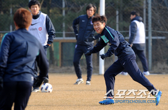 서정진은 오후 3시30분 공식 훈련이 시작되고서야 모습을 드러냈다. 소속팀 훈련 관계로 빠진 J-리거 등을 제외하고 13명만 훈련장에 나서 스트레칭, 패스 게임 등 가벼운 훈련을 진행했다. 몸 상태가 좋지 않은 윤석영(22·전남) 정동호(22·가이나레 돗토리)는 러닝을 하며 몸을 풀었다. 공격진은 슈팅 및 세트피스 훈련에 초점을 맞췄다. 서정진을 비롯해, 윤빛가람(22·성남) 백성동(21·주빌로 이와타) 정우영(23·교토상가) 등은 경쾌한 슈팅으로 연신 골문을 갈랐다. 오만전의 중요성을 잘 알고 있는 만큼 발끝에 힘이 실려 있었다. 홍 감독은 날카로운 눈빛으로 선수들의 슈팅 동작을 유심히 살폈다.