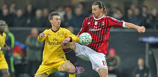 ◇아스널이 AC밀란과의 유럽챔피언스리그 16강 1차전에서 0대4 대패를 당했다. 아스널 수비수 로랑 로시엘니(왼쪽)가 AC밀란 공격수 즐라탄 이브라히모비치와 볼을 다투고 있다. 사진출처=아스널 구단 홈페이지