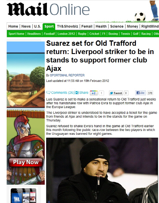 맨유 수비수 에브라를 향한 인종차별 발언과 악수 거부 사태로 최근 고개를 숙였던 리버풀 공격수 수아레즈가 다시 맨유 홈구장인 올드트래포드에 모습을 드러낼 전망이다.