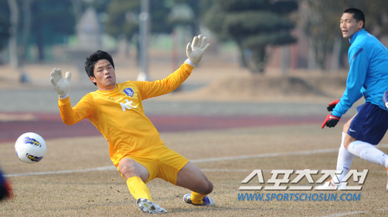 22일 오전 전남 영암 현대삼호중공업 사계절 잔디구장에서 최강희 감독이 이끄는 A대표팀이 훈련을 갖었다. 정성룡 골키퍼가 전술 훈련 도중 수비를 하고 있다. 영암=송정헌 기자 songs@sportschosun.com |