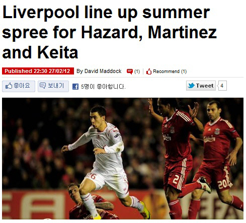 28일(한국시각) 영국 일간지 데일리미러는 리버풀이 칼링컵 우승 후 대형스타를 영입하겠다고 공언했다고 보도했다. 데일리미러에 따르면 리버풀의 영입리스트에는 빌바오의 플레이메이커 하비 마르티네스, 바르셀로나의 세이두 케이타, '벨기에의 호날두' 에당 아자르(릴)이 포함된 것으로 알려졌다.