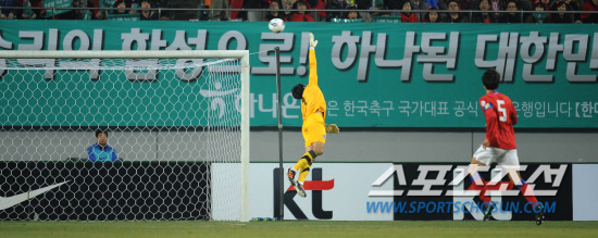 ◇29일 오후 서울 상암월드컵구장에서 2014 브라질월드컵 아시아 3차예선 한국과 쿠웨이트의 최종전이 열렸다. 후반 쿠웨이트의 슈팅이 정성룡의 손끝을 넘어 크로스바에 맞고 있다. 김경민 기자 kyungmin@sportschosun.com