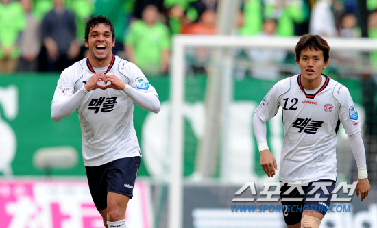 3일 오후 전주월드컵경기장에서 현대오일뱅크 K리그 2012 개막전 전북현대와 성남일화의 경기가 열렸다. 성남 에벨톤(왼쪽)이 후반 동점골을 성공시키고 팬들에게 하트 세리머리를 펼치며 환호하고 있다. 전주=송정헌 기자 songs@sportschosun.com/2012.3.3