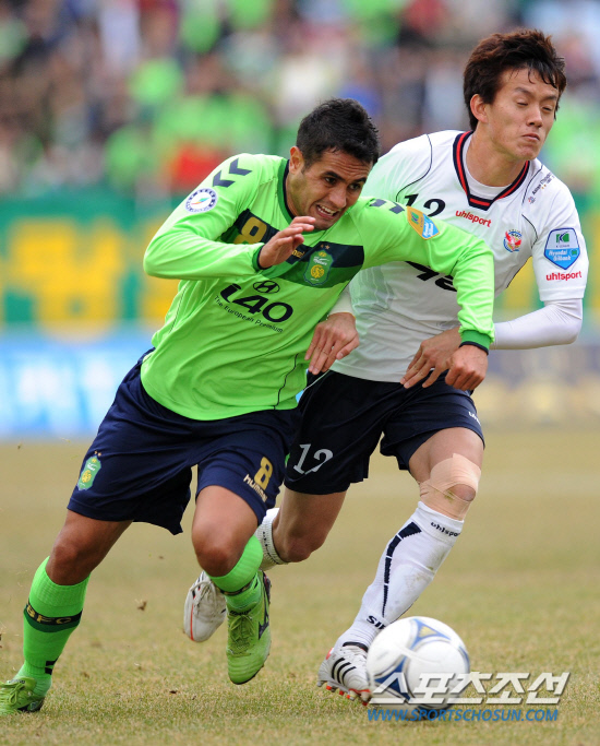 3일 오후 전주월드컵경기장에서 현대오일뱅크 K리그 2012 개막전 전북현대와 성남일화의 경기가 열렸다. 전북 루이스와 성남 박진포가 볼 다툼을 벌이고 있다. 전주=송정헌 기자 songs@sportschosun.com/2012.3.3