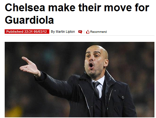6일(한국시각) 영국 일간지 데일리미러는 안드레 비야스-보아스 감독을 경질한 첼시가 대리인을 통해 과르디올라 감독에게 의중을 던졌다고 보도했다. 로만 아브라모비치 첼시 구단주는 과르디올라 감독에게 3년 계약에 5000만파운드(약 900억원)의 몸값을 제시한 것으로 알려졌다.