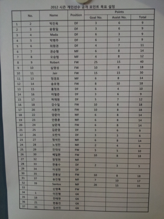 제주 유나이티드 클럽하우스의 각 층 게시판에는 같은 종이가 붙어 있다. '2012시즌 개인별 공격포인트 목표치'가 그것이다.