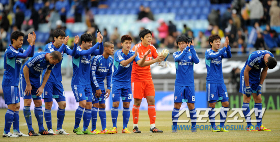 ◇수원 삼성과 부산 아이파크 간의 2012년 K-리그 1라운드가 열린 4일 수원월드컵경기장. 1대0으로 승리한 수원 선수들이 서포터즈에게 인사를 하고 있다. 수원=허상욱 기자 wook@sportschosun.com