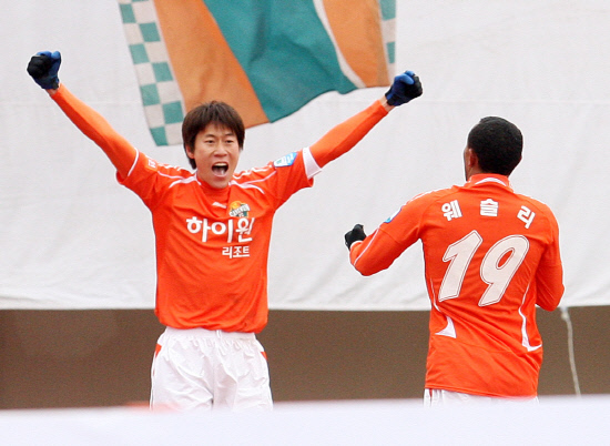 ◇김은중은 후반 20분과 30분 각각 헤딩슛과 페널티킥으로 대구 골망을 흔들었다. 선제골을 넣은 뒤 서포터스석으로 달려가 세리머니를 하는 김은중.