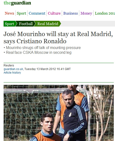 일각에선 무리뉴의 거취가 2002년 이후 들어올리지 못한 유럽챔피언스리그 우승 트로피에 달려있다고 한다. 무리뉴는 단호하게 "아니다"고 했다. 무리뉴는 "나의 미래가 이번 경기에 달려있는 것은 아니다. 구단이 나를 해고하지 않는 이상 한 경기에의 승패에 따라 거취가 흔들리지 않는다"고 했다. 즉, CSKA모스크바전에서 패하더라도 무리뉴가 레알 마드리드에 잔류할 것임을 드러낸 발언이다.