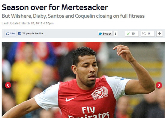 페어 메르테자커(아스널)가 이번 시즌 출전이 불투명할 것으로 보인다.