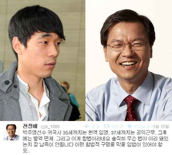 천 의원은 지난 17일 자신의 트위터에 "박주영 선수 귀국 시 35세까지는 현역 입영, 37세까지는 공익근무, 그 후에는 병역 면제. 그리고 이게 합법이라네요"라며 "솔직히 무슨 법이 이리 돼있는지 잘 납득이 안 됩니다. 이런 합법적 구멍을 막을 입법이 있어야 할 듯"이라는 글을 올렸다.