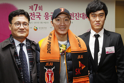 신속한 초기 응급조치로 의식을 잃고 그라운드에 쓰러진 신영록(가운데)의 생명을 구한 김장열 제주 트레이너(맨왼쪽)와 대구 수비수 안재훈. 김장열 트레이너와 안재훈은 공로를 인정받아 지난해 12월 보건복지부 장관상을 수상했다. 사진제공=제주유나이티드