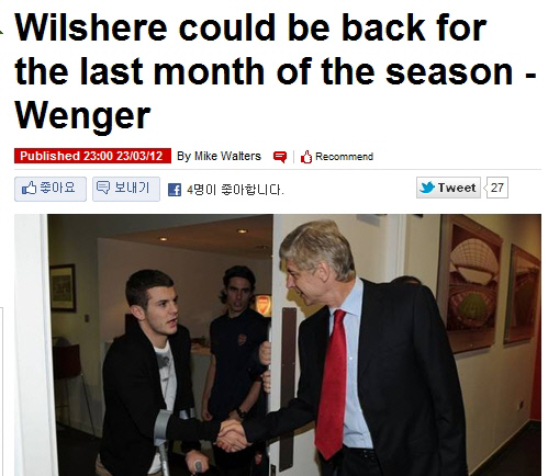 아르센 벵거 아스널 감독은 24일(한국시각) 영국 일간지 데일리미러를 통해 윌셔가 3주 내에 훈련을 시작하고, 시즌 마지막달 쯤에는 그라운드에 모습을 드러낼 수 있을 것으로 전망했다. 그는 "윌셔가 볼과 함께 하기 시작했다. 이는 우리에게 큰 의미다. 3주 정도면 선수단에 합류할 수 있고, 2주면 경기에 나설 준비를 끝낼 수 있을 것"이라고 했다.