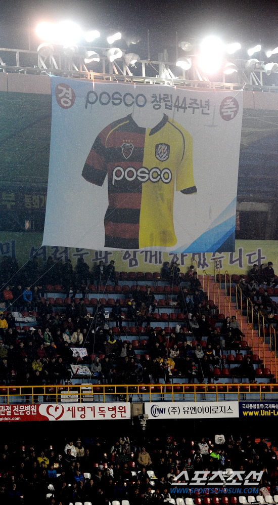 30일 포항 스틸야드. 본부석 건너편에 있는 관중석에는 큰 현수막이 걸렸다. 가슴에 포스코라고 박혀 있는 유니폼. 포스코를 최대 스폰서로 둔 포항의 유니폼도, 전남의 유니폼도 아니었다. 유니폼 왼쪽 반은 빨간 줄무늬의 포항이, 오른쪽 반은 노란 유니폼의 전남이 현수막의 '지분'을 차지했다. 포스코를 중심으로 하나가 된 포항과 전남이었다. 이날 경기의 의미를 보여주는 상징적인 현수막이었다.